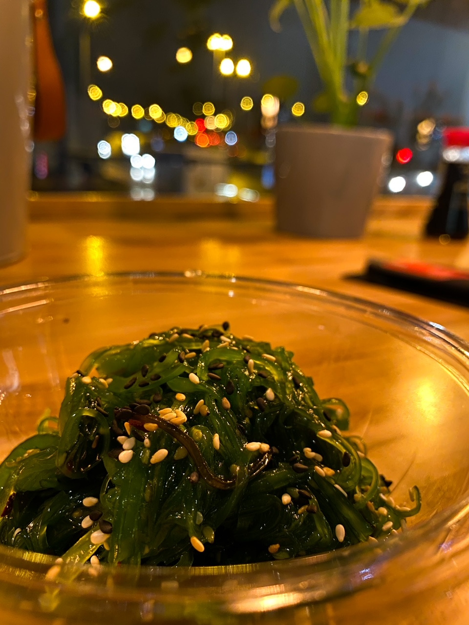 krewetki parzone, ogórek, kanpyo, oshinko, sałata, mango, sezam -